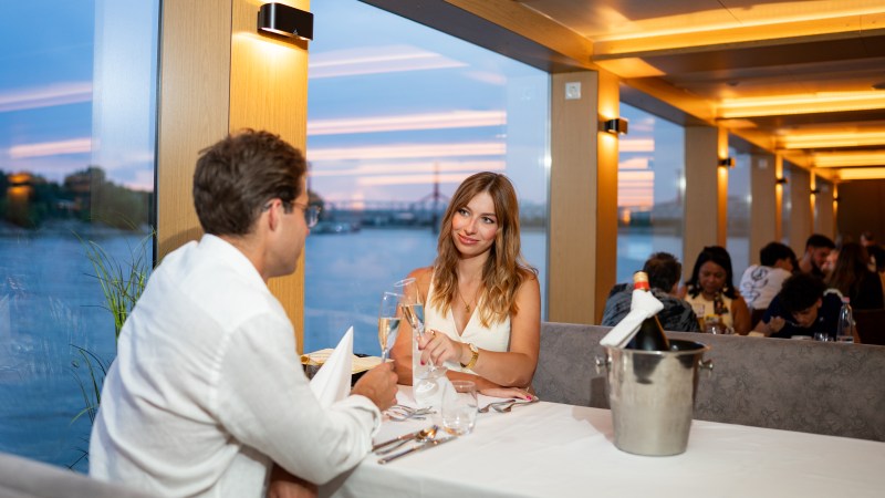 Expect white tablecloths, professional table service, and an always-onboard ship captain ensuring everything runs perfectly. -